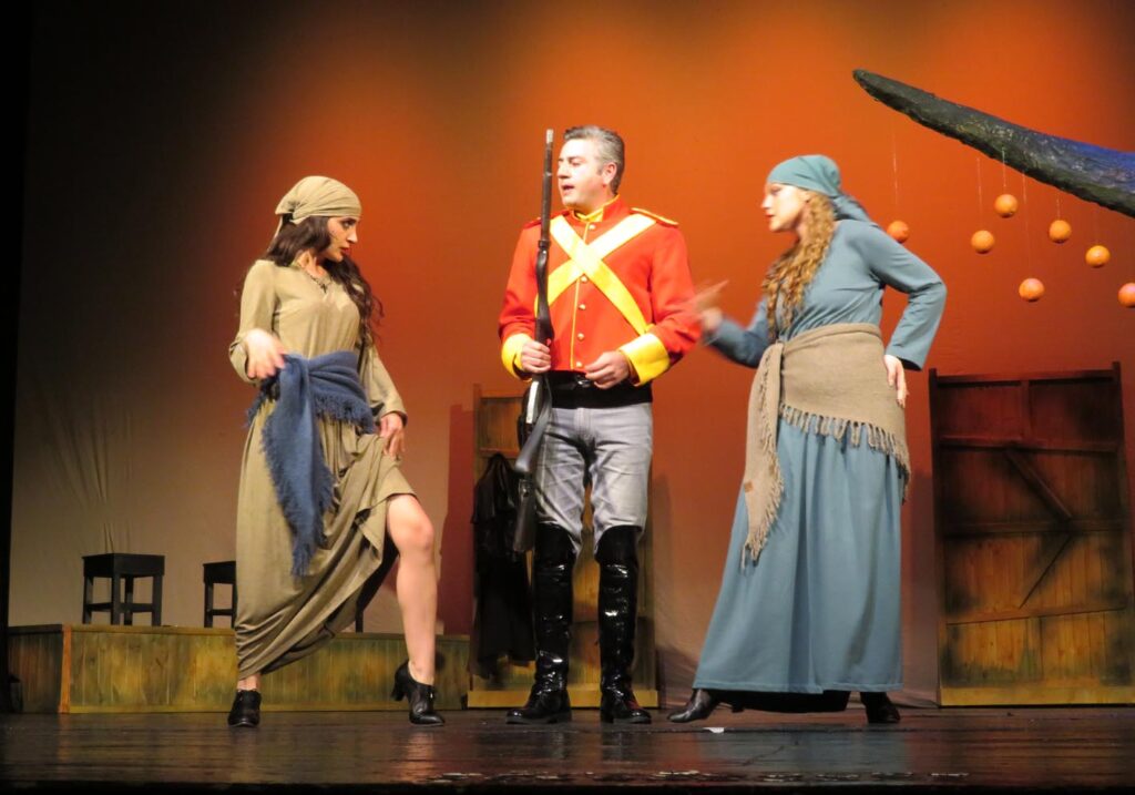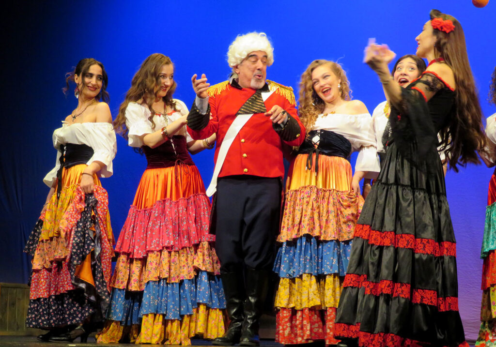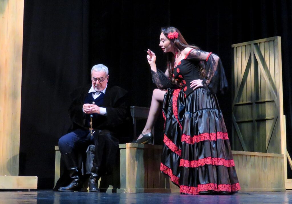 К тому же как П.Мериме, так и И.Иман в изобилии используют испанские и цыганские слова, которые добавляют колорита, но вынуждают погружаться в словари. Поэтому перед просмотром спектакля стоит запомнить хотя бы, что «вента» – это постоялый двор, «минчорро» – любовник, «паильо» – нецыган, «ром» и «роми» – муж и жена, «миньоны» и «коррехидоры» – представители испанских силовых структур, «макила» – боевой шест, «пиастры», «дукаты», «дуро», «гинеи» – местная валюта, «Агур лагуна» – приветствие «Здравствуй, товарищ!», а Андалусия, Севилья, Кордова, Марбелья, Монтилья, Монда, Элисондо, Этчалар, Гвадалкивир, Наварра, Памплона, Витория, Триана, Ронда, Лалоро, Гранада – испанские топонимы.