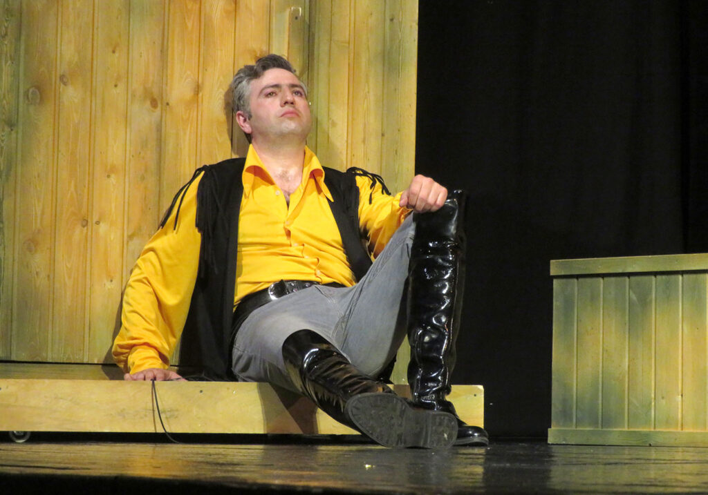 Начать хотя бы с того, что в постановке нет француза-повествователя, но есть сразу два Хосе – «старый» (Фуад Османов) и «молодой» (Мурад Мамедов). Хосе таким образом оказывается меж двух временных пластов. «Молодой» рассказывает, а «Старый» анализирует и как бы общается сам с собой. При этом Хосе Лисаррабенгоа, по желанию прозаика, превратился из стражника в бандита, а Хосе Наварро, по желанию драматурга, превратился из бандита в чудаковатого археолога, занимающегося походами Юлия Цезаря.